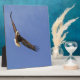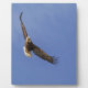 An adult bald eagle in a sharp turn highlighted by a blue sky.