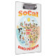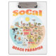 A spectacular cartoon of Southern California – showcasing Los Angeles, Orange County, San Diego. This bright and charming scene has it all – a surfer hangs ten while a couple play in the water, a killer whale leaps up, a muscular beach couple both flex to impress, zoo animals wait for tourists, a t-rex roars a challenge, all beneath the bright California sun shining high above it all.