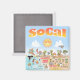 Bright and colourful scene offers a spectacular view of Southern California - wacky characters frolic on the beach and desert of SoCal showcasing Los Angeles, San Diego, Orange County, Santa Barbara, Riverside, Palm Springs, Palm Desert, El Centro and Anza Borrego and Joshua Tree parks as well as the border cities of Tijuana, Tecate and Mexicali. This charming scene has it all – a surfer hangs ten while a killer whale leaps out of the water, zoo animals greet the tourists, a muscular beach couple both flex to impress as a T-Rex roars a challenge and a tank moves into position and much more…