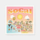Bright and colourful scene offers a spectacular view of Southern California - wacky characters frolic on the beach and desert of SoCal showcasing Los Angeles, San Diego, Orange County, Santa Barbara, Riverside, Palm Springs, Anza Borrego and Joshua Tree parks as well as the border cities of Tijuana, Tecate and Mexicali. This charming scene has it all – a surfer hangs ten while a killer whale leaps out of the water, zoo animals greet the tourists, a muscular fellow flexes to impress as a T-Rex roars a challenge and a tank moves into position and much more…