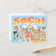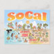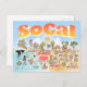 Bright and colourful scene offers a spectacular view of Southern California - wacky characters frolic on the beach and desert of SoCal showcasing Los Angeles, Orange County, San Diego, Santa Barbara, Riverside, Palm Springs, El Centro, Anza Borrego and Joshua Tree parks as well as the border cities of Tijuana, Tecate and Mexicali. This charming scene has it all – a surfer hangs ten while a killer whale leaps out of the water, zoo animals greet the tourists, a muscular beach couple both flex to impress as a T-Rex roars a challenge and a tank moves into position and much more…