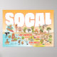 Bright and charming cartoon illustration offers a whimsical view of Southern California - cute characters enjoy the warm California sun showcasing Los Angeles, San Diego, Riverside, Palm Springs, Anaheim and Long Beach as well as the border cities of Tijuana, Tecate and Mexicali.