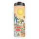 Bright and colourful scene offers a spectacular view of Southern California - wacky characters frolic on the beach and desert of SoCal showcasing Los Angeles, Orange County, San Diego, Santa Barbara, Riverside, Palm Springs, El Centro, Salton Sea, Anza Borrego and Joshua Tree parks as well as the border cities of Tijuana, Tecate and Mexicali. This charming scene has it all – a surfer hangs ten while a killer whale leaps out of the water, zoo animals greet the tourists, wine lovers make a toast as a hiker is scanned by a UFO and much more…