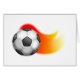Colourful illustration of a soccer ball flying through the air with a trail of heat or flames of fire being left in it's wake. Image available on various gifts and products.