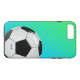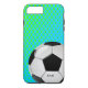 Custom soccer fan iPhone 7 Plus case, with graphics of a blue and green dot pattern background. Graphics of a soccer ball decorates the bottom right corner of the case and custom black text, on the bottom, is ready to personalise. Great phone case for the sports fan or soccer player.