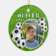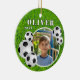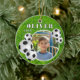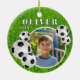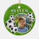 Soccer Ball Football Grass Sports Photo Ceramic Ornament. Ornament with soccer balls, a name and a photo in a round frame on a green grass background.