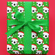 This Christmas wrapping paper features soccer balls wearing Santa's hat with snowflakes twirling around on a Christmas green background.