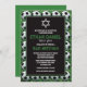 If your son is a soccer enthusiast with dreams of the World Cup, then this affordable all-in-one soccer Bar Mitzvah invitation may be a perfect way to celebrate his big day. This soccer invite has your son's name printed in a green sports-look font with his Hebrew name in white below on a black text area trimmed in green and white. There is a border of green grass all around the black text area with many black and white soccer balls surrounding the main text area. There is a white Star of David at the top of the text area that can be removed or moved if you prefer. The backside has a black and white soccer ball on the same shade of green that is used on the front wording. There is optional reception wording and RSVP details printed in white, making this a very affordable option to save on stationery costs. Delete the words on the back if you don't need the. If you would like separate enclosure cards, or if you need any other matching items, please email niteowlstudio@gmail.com and watch your junk/spam folder for my reply.