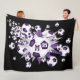 This cute girl's soccer fleece blanket features an "explosion" of varied size purple & white soccer balls and grey, purple and white star shapes on a customisable black background - the soccer balls' typically black panels have been recolored purple - customise with athlete's name, monogram and jersey number - katz_d_zynes