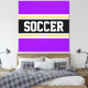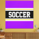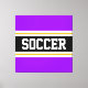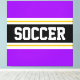 This colourful sporty design features bold SOCCER text inside a wide black horizontal centre stripe with white and golden yellow racing stripes against bright purple outer stripes. The text can be personalised.