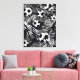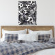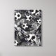 This stretched canvas wall art is shown with a black grey multi colour soccer ball art print.