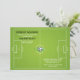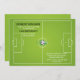 A bird's eye view of a green soccer field with a soccer ball in the centre. The ball can be made larger or smaller (+-) or dragged to any location on the invitation. A unisex design for all ages.