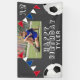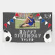 Soccer Football Ball Flags Blue Photo Birthday Party Banner. The design has two soccer balls and birthday party bunting flags in red, blue and white colours on grey. Add your photo and personalise it with your name, age and text and make your own birthday party banner. Great for boys and girls who love soccer, football.
