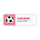 Send your soccer party invitation along with our soccer return address label. Design features a soccer ball on red stripes background. Colour theme is customisable, click ‘customise’ and change the background colour to your favourite soccer team colour. This football soccer return address label is perfect for your soccer birthday party, sport party, soccer themed baby shower or your little boy’s sport themed name and address labels.