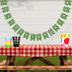 Green background for the soccer field with white field markings and a black and white soccer ball. This bunting says "Concession Stand" for your soccer, football parties.
