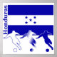 Three soccer players play in front of the Honduran flag. Country name Honduras is on the side