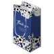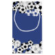 Soccer balls surround this blue personalised gift bag with editable text. Multiple soccer balls, black, white and grey design to compliment our Soccer Invitational party invitation set.