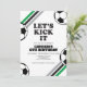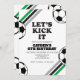 Let's Kick It! Soccer Birthday invite with green, black and grey stripes.