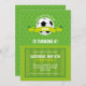 A fun Soccer Party or Sports Party Invitation in a green color scheme, featuring a soccer ball illustration with a soccer net and soccer field background. Perfect for a little boy or sporty girl's birthday party.