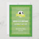 A fun Soccer Party or Sports Party Invitation in a green color scheme, featuring a soccer ball illustration in a soccer field background. Perfect for a little boy or sporty girl's birthday party.