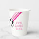 It's Game Time! Soccer Birthday paper cups with pink stripes and soccer ball.