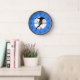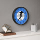 This clock features the silhouette of a soccer player inside a white circle. Around the white circle, there is a blue outer ring and black numbers. The text on this clock and the blue outer ring can be personalised. The wooden clock frames are available in three colours.