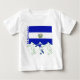 Three El Salvadoran soccer players in silhouette play in front of the El Salvadoran flag. Country name El Salvador is on the side.