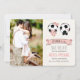 A cute way to announce how you will be kicking off forever soon with these pink and black soccer wedding save the date invitations a bride and groom soccer ball on it. The bride soccer ball wears a pink bow and holds a bouquet of pink flowers while the groom soccer ball wears a black bowtie with a pink heart shaped kiss on his cheek. The back of the soccer themed save the date card can be customised with three more of your favourite engagement photos. This fun and adorable soccer themed wedding invite is perfect for the couple who loves to coach, play or watch soccer, or futbol and football, as it is known to rest of the world! Artwork © Chrissy H. Studios, LLC. All rights reserved.