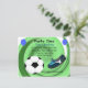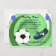 A cool sporty soccer game themed birthday party invitation. A soccer ball and a soccer shoe on a bright green and white swirl background. Get ready to kick it! Customise with all your own information as desired.