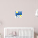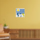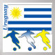Three soccer players play in front of the Uruguayan flag. Country name Uruguay is on the side