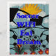 The artwork features the words "Soccer," "WIFI," "Eat," and "Dream" stacked vertically in a bold, blue, slightly stylised font. These words are the central focus and are positioned against a multi-layered and somewhat whimsical background. The background includes outlines of several black and white soccer balls of varying sizes, a radiant yellow sunburst at the top, and colourful floral patterns at the bottom. The overall colour palette is a mix of blues, yellows, reds, and greens on a textured, light blue or grey base. The different elements are layered, creating a visually busy and playful composition.