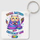 Vibrant, colourful design featuring a cosy cat wrapped in a blanket, sitting next to a stack of books sipping coffee. The colourful text reads: "Social battery critically low". This design is available on a wide variety of products.