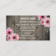 Rustic wood look, pink floral social media business cards for wedding planners and other professionals, especially those wedding-related- Wedding organiser business cards with old grey, bleached look, rustic wood barn planks background. Front has name in palest grey, elegant script and professional title below. Matching, pretty pink floral bouquets adorn opposite corners. On the back, Business name is at top with personalised email, business and cell phone numbers, and various social media contacts for promotional opportunities such as personal website, Facebook, linked, twitter, or any custom contact details or information you prefer. Matching rustic wood background and pink flowers on back. Not just for event planners, but for many professions, especially those related to flowers, health, and beauty businesses, like florists, hairstylists, beauty spas, massage therapists, makeup artists, hairstylists, manicurists, etc. Great for professional networking. Keep extras to hand out. Perfect for professionals that specialise in rustic country weddings, barn weddings, outdoor weddings, garden weddings, western themed weddings, etc. All the text styles, colours, and sizes can be changed. Click the Customise button to edit.