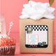 Square sticker to match our "Sock Hop" invitation with an image of a 50s classic tabletop jukebox and 45 rpm records on a layered background of a black and white chequerboard, solid pink, pink polka dots on white, and black. See matching invitation, envelope and label. See the entire Nifty 50s Sticker collection in the INVITES | Stickers & Labels section.