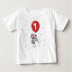 First birthday cute sock monkey in red and turquoise hanging on a red balloon with big number 1.