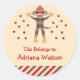 Cute and modern sticker with a Sock Monkey theme. It features a cute sock monkey with dots around and a stripes bottom border. This label is a back to school must have. Use it to label books, notebooks, folders, pencil boxes, lunch boxes, crayons, markers and other school supplies. It provides an easy way to identify your child’s belongings, just peel and stick. Add your own wording.