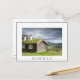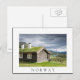 Postcard of a sod roof log cabin with grass on top with a great view over a green valley and a Norwegian flag in Jotunheimen national park in Norway with a white border and the text: 'Norway'.