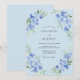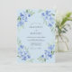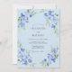 This design features a serene palette of cerulean and sky blue watercolor florals set against a soft, airy background. Delicate clusters of hydrangeas and romantic roses are intertwined with graceful green foliage and eucalyptus sprigs. The aesthetic evokes a sense of timeless elegance and springtime freshness, perfect for a romantic botanical event.