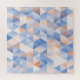 Triangles intertwine in soft blues and oranges. An artful masterpiece of geometric harmony.
