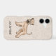 Destei's original cartoon illustration of a cute Soft-coated Wheaten Terrier breed dog. The dog is standing with his head turned towards the viewer. Typical to the breed the dog's eyes are covered with hair and the dog's tail is pointing upwards. The background colour is light beige with a decorative texture. The texture can be removed and the background colour can be changed to any other colour, if so wished. There is also a personalizable text area for a name or other custom text.