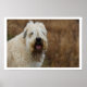 Photograph of a soft-coated Wheaten terrier standing in autumn grass.