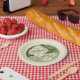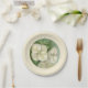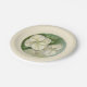 Artwork in pastel hues depicting elegant cream and white hydrangea flowers with their buds on a muted green background surrounded by a pale creamy yellow decorates this pretty floral paper plate.