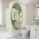 This shower curtain features artwork in pastel hues depicting elegant cream and white hydrangea flowers with their buds on a muted green set against a cream coloured background that may be customised to suit your bath decor.
