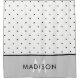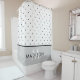 This stylish and chic shower curtain features black and white polka dots, with a bottom border in soft grey. Personalise with your name and initial.