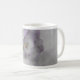 A square format still life of purple and white pansies in a white vase. Image has been desaturated with an added textured background.
