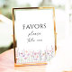 Add a thoughtful touch to your reception with this watercolor wildflower “Favors – Please Take One” sign. Featuring a hand-painted spray of blush, lavender, sage and peach blooms framing elegant modern script, this sign guides guests to your wedding favors in style. Perfect for rustic, boho, or garden weddings, it pairs beautifully with the matching wildflower wedding suite, including invitations, table numbers, place cards, and more. A lovely way to create a cohesive look for your celebration.