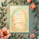 This elegant pastel wedding design features a delicate watercolor arch surrounded by soft floral details in shades of blush, mint, and warm gold. The subtle golden frame adds timeless sophistication, while the gentle colour gradients evoke serenity, love, and joyful celebration. Ideal for modern Arab weddings, Nikah events, and multicultural ceremonies, it brings together beauty, calm, and refinement.