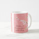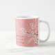 Pretty and girly soft pink cherry blossom design features a branch from the pink flowering cherry or dogwood tree sakura. Baby pink background with light swirls, with a foreground of dark brown tree branches with petals and green leaves. A lovely design for baby shower, feminine events or occasions.