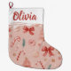 "Add a touch of sweet holiday charm to your décor with this soft pink Christmas stocking. Featuring a delightful festive pattern, it showcases Christmas trees, candies, stars, and classic candy canes throughout. The gentle pastel color pairs beautifully with its whimsical illustrations, creating a cozy and cheerful look perfect for mantels, stair rails, or holiday displays. Soft, stylish, and full of Christmas spirit, this stocking makes a lovely addition to any festive home."