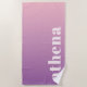 Modern, trendy beach towel with a soft pink to purple gradient and your name in bold, retro font letters.